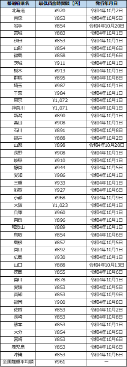 ちなみに最新の都道府県別最低賃金は、以下のように定められています(出典:厚生労働省WEBサイト)。